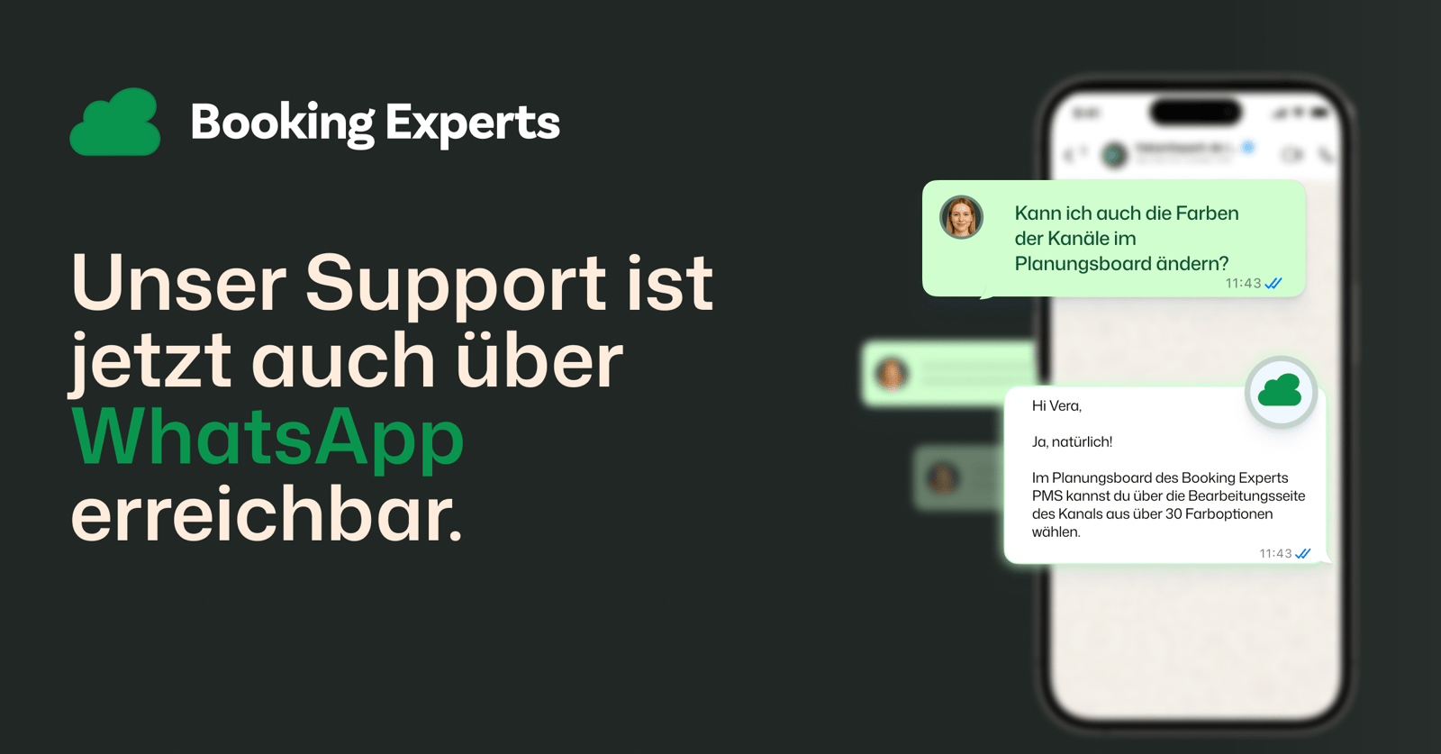 Bei Booking Experts dreht sich alles um Benutzerfreundlichkeit – nicht nur in unserer Software, sondern auch in unserem Service. Wir möchten, dass unsere Nutzer:innen schnell und unkompliziert Unterstützung erhalten, genau dann, wenn sie sie brauchen. Deshalb führen wir einen neuen Weg ein, um mit uns in Kontakt zu treten: WhatsApp-Support.