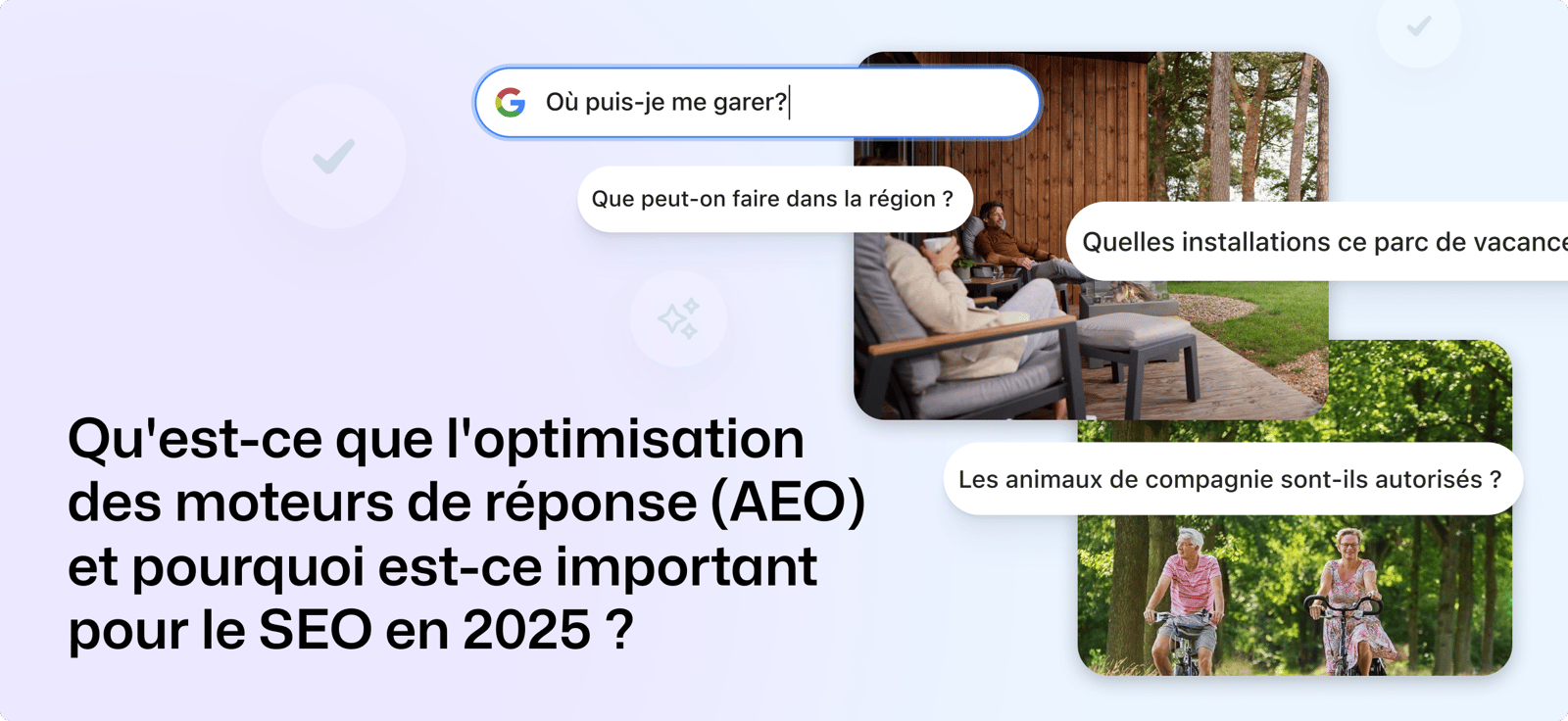 Chez Booking Experts (BEX), nous utilisons l'AEO SEO pour aider les professionnels de l’hôtellerie de plein air à se démarquer dans les résultats de recherche, en structurant le contenu autour des questions des clients. Nous nous assurons que votre établissement apparaisse plus souvent dans les résultats des moteurs de recherches IA et vocaux ainsi que dans les featured snippets de Google.