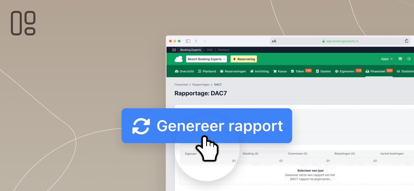 Deze gevraagde verhuurgegevens omvatten persoonlijke gegevens van de eigenaar van de verhuurde accommodatie, gegevens over de accommodatie zelf, en gegevens over de verhuurde periodes en de daarmee verdiende inkomsten. Dat is een gigantische berg aan data voor parken met veel particuliere eigenaren. Bij Booking Experts hebben we daarom een functionaliteit ontwikkeld die het onze klanten mogelijk maakt de benodigde gegevens in een overzichtelijk rapport uit hun reserveringssysteem te halen.
